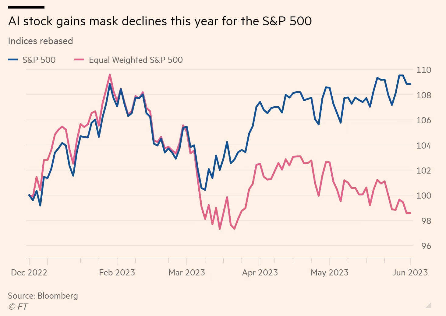 A Handful of Tech Stocks Drive Diverging Measures of S&P 500 Performance. An equal weight version of the index slips into negative territory even though benchmark is up 9.5% this year; it is interesting to see this in chart form.
