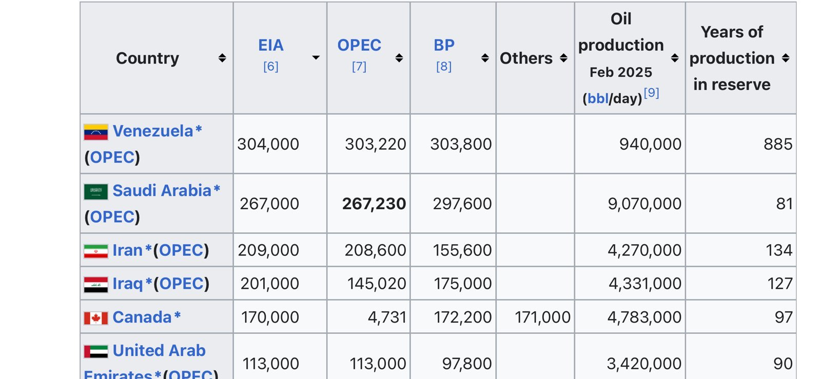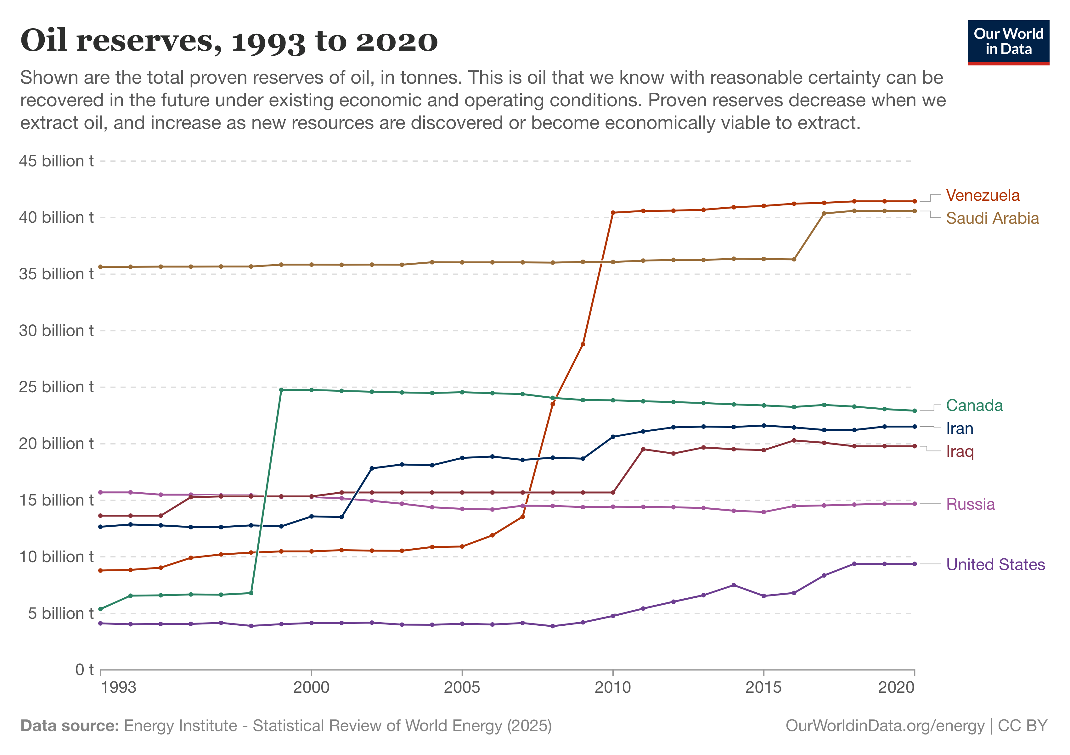 Since the country is in the news as the latest potential target for the newly renamed ‘Department of War, ’ I thought it was worth looking at this chart from Our World In Data. Venezuela is the global leader - ahead of Saudi Arabia - in oil reserves, but only produces 10% of what Saudi Arabia does (chart below).