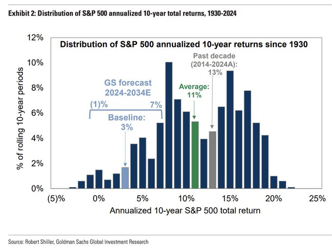 From a Recent Goldman Report. We estimate the S&P 500 will deliver an annualized nominal total return of 3% during the next ten years (7th percentile since 1930) and roughly 1% on a real basis.