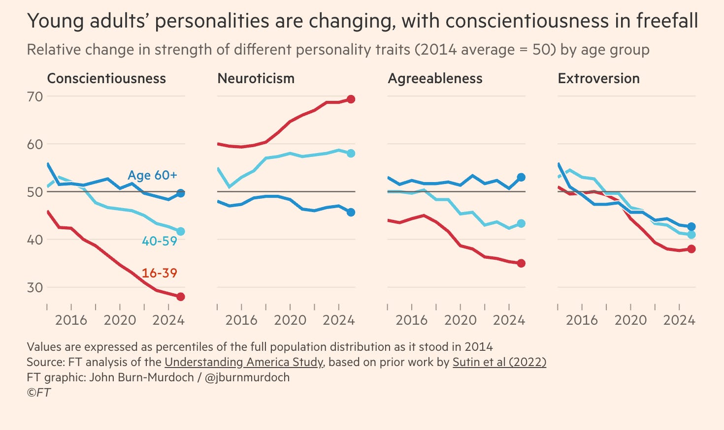 The Troubling Decline in Conscientiousness presented data from Understanding America in the FT. Sharing one person’s point-of-view, I spent my Saturday evening with a group of friends on a porch, eating and sharing stories; one brought their three teenagers along, including a rising freshman at Texas A&M who was more than happy to engage us all in conversations. Here’s hoping there are more out there like him.