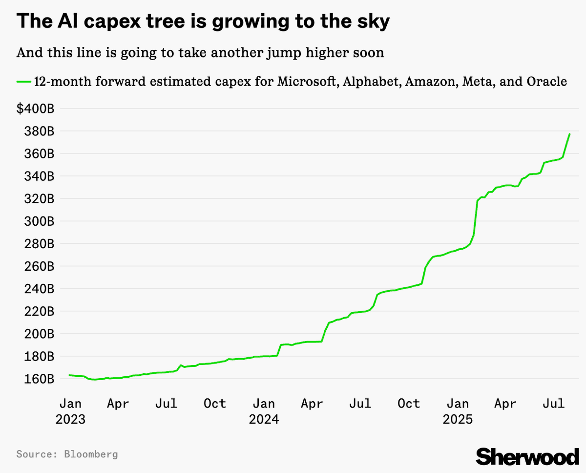 spending on AI infrastructure has already exceeded spending on telecom and internet infrastructure from the dot-com boom—and it’s still growing… one explanation for the U.S. economy’s ongoing strength, despite tariffs, is that spending on IT infrastructure is so big that it’s acting as a sort of private-sector stimulus program.