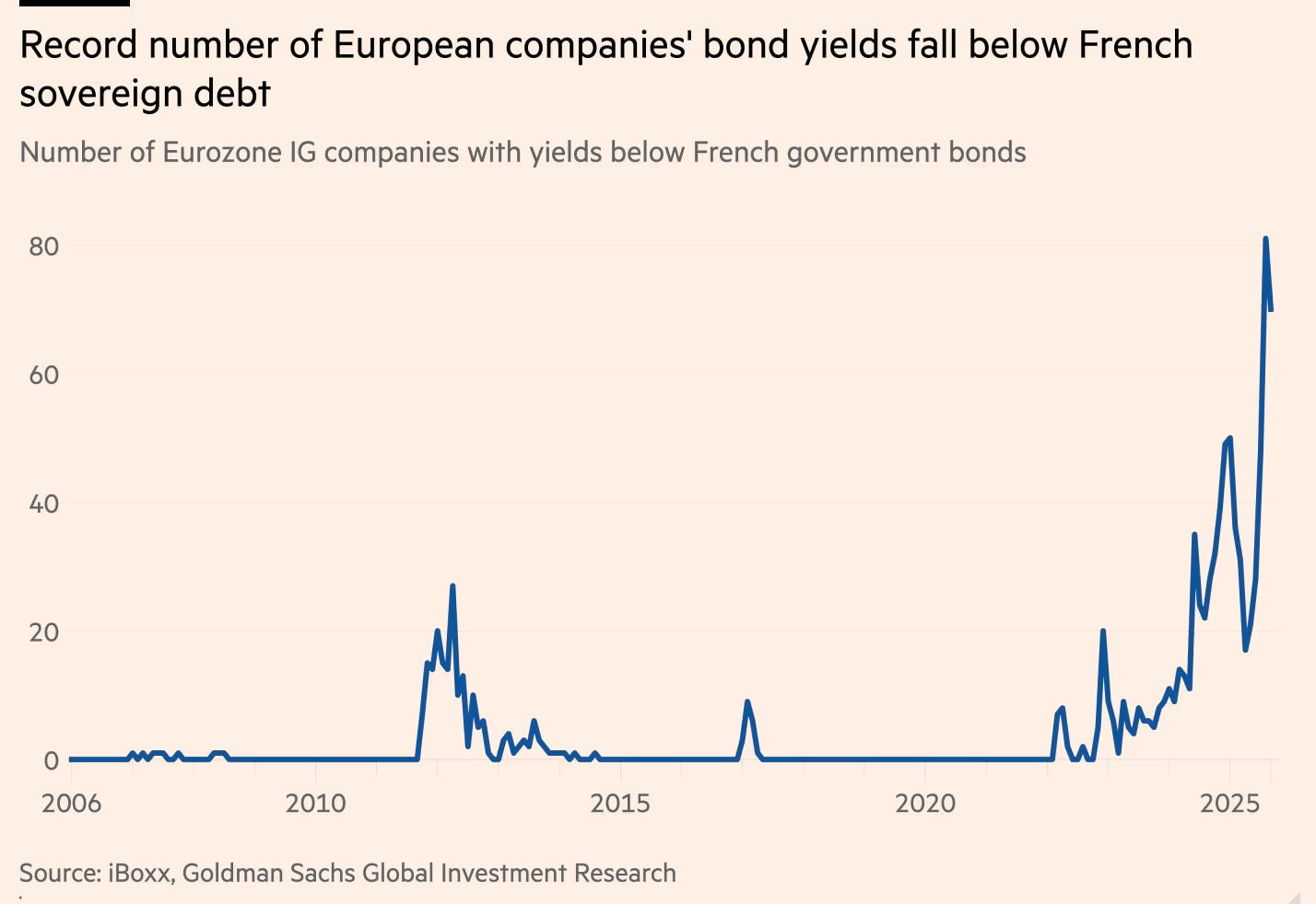There is no way the government can keep everyone happy, and fiscal deficits are beginning to reflect strongly in the bond market. The chart below is also quite exceptional as French Companies’ Borrowing Costs Fall Below Government’s as Debt Fears Intensify (in the FT). Lower yields for groups including L’Oréal, Airbus, and Axa shake up the typical order and signal Paris’s loss of ‘risk-free’ status.
