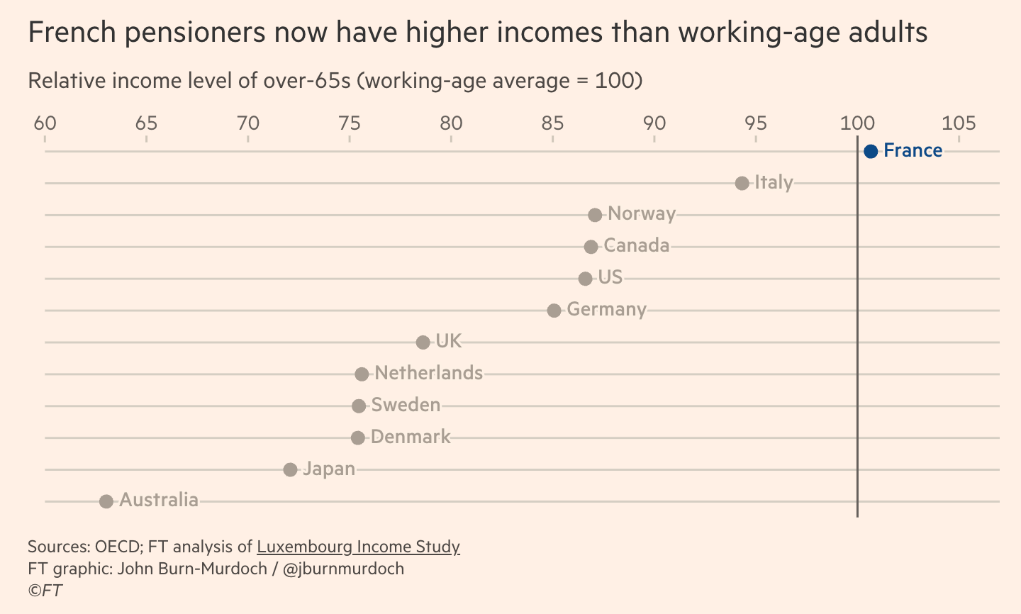 But the FT also released several graphics (see below) which shows that pensioners now have higher incomes than working adults. And Italy, Norway, Canada, the US, and Germany are not that far behind.
