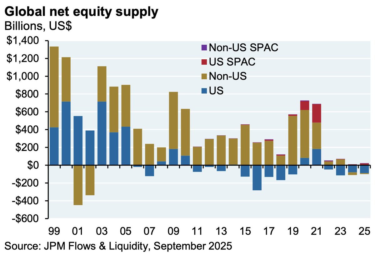 One idea is that there is a limited supply of equities available for purchase. Why? As the FT describes, uncertain executives are favoring share buybacks over tapping buoyant markets to fund investment.