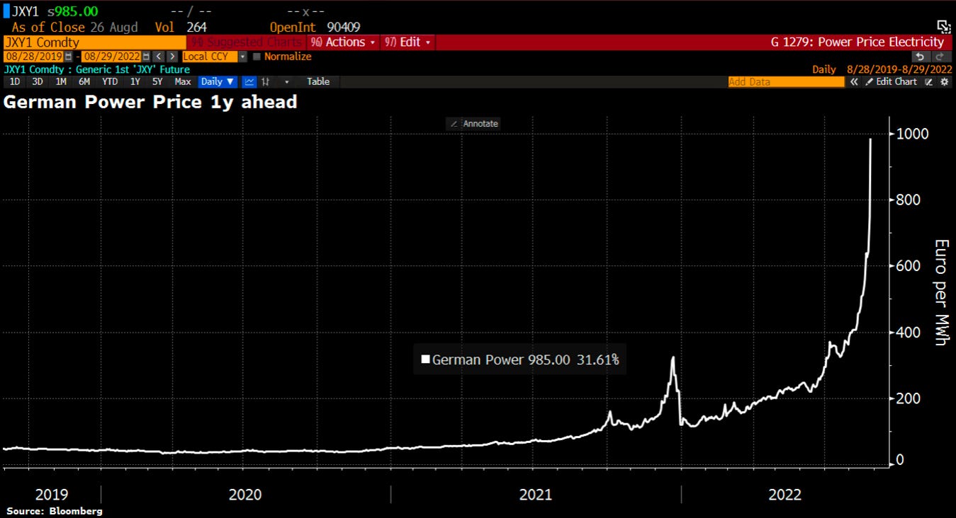 The forward-looking energy markets in Europe are beginning to price in a winter shortage. Prices are spiking. Below shows the one-year ahead power price increasing to almost €1,000 per megawatt hour or 720% year to date.