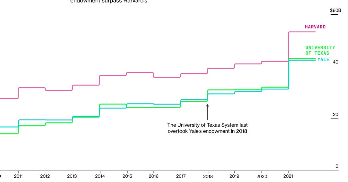 The University of Texas system is unlike other colleges because of its oil-rich land assets that are driving record revenue this year. It may be the largest college endowment by the end of year. Article in Bloomberg here. ESG investing is going to be tested as those that are completely divested from oil will underperform.