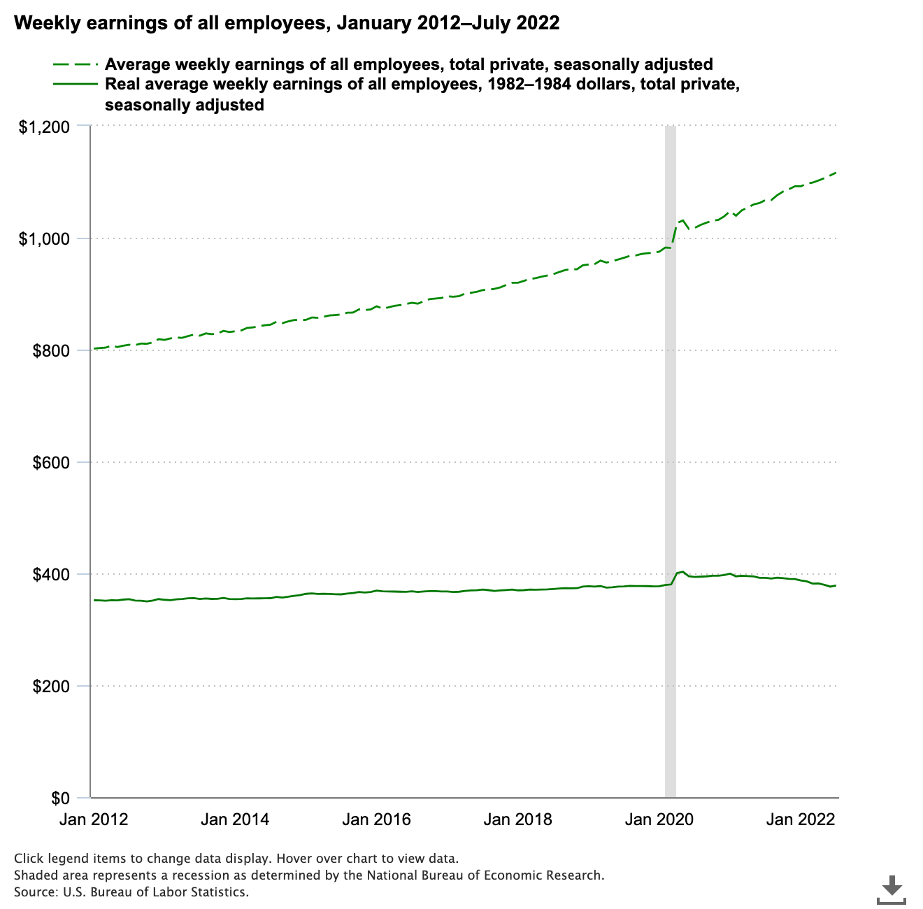Here are some other interesting points to consider. If you adjust for inflation, weekly wages are going down and are now at pre-Covid levels (graph below). This doesn’t even include benefits information.