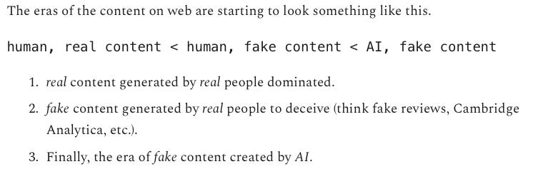 The New Normal: The Coming Tsunami of Fakery: How the Dead Internet Theory is fast becoming a reality thanks to zero marginal-cost content generated at an infinite scale. Here. The key concept is pasted below.