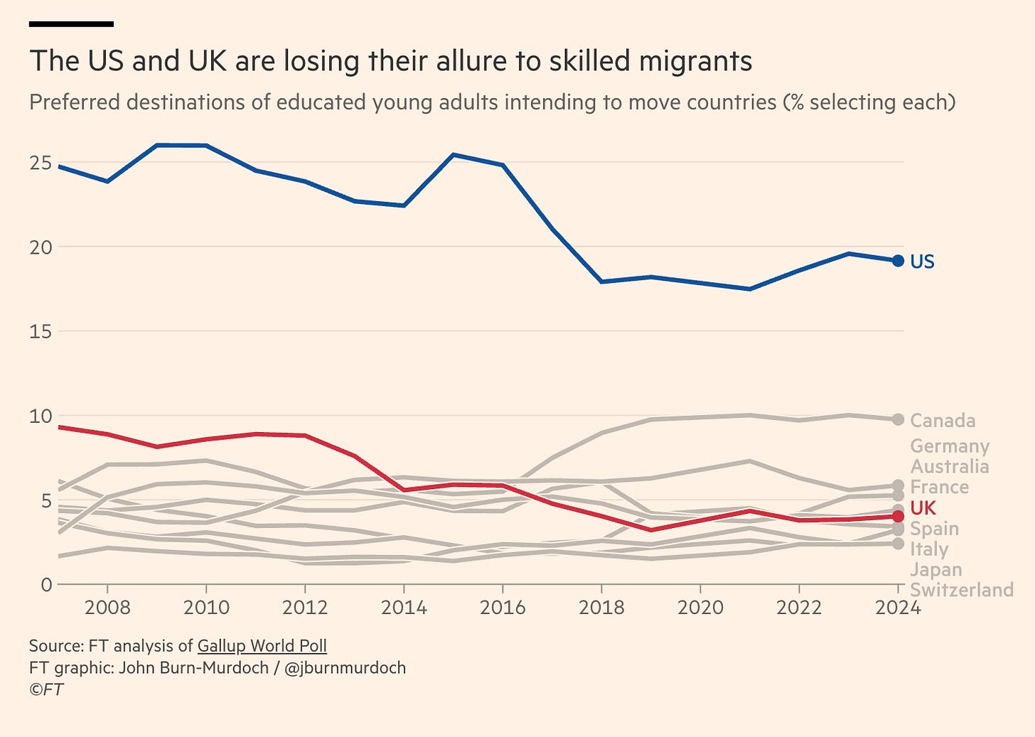 Are Britain and the US Losing Their Allure for Top Talent? Open hostility and high visa fees are a risky bet amid intensifying competition for the world’s brightest and best, in the FT. Canada appears to be absorbing a good share of the difference.
