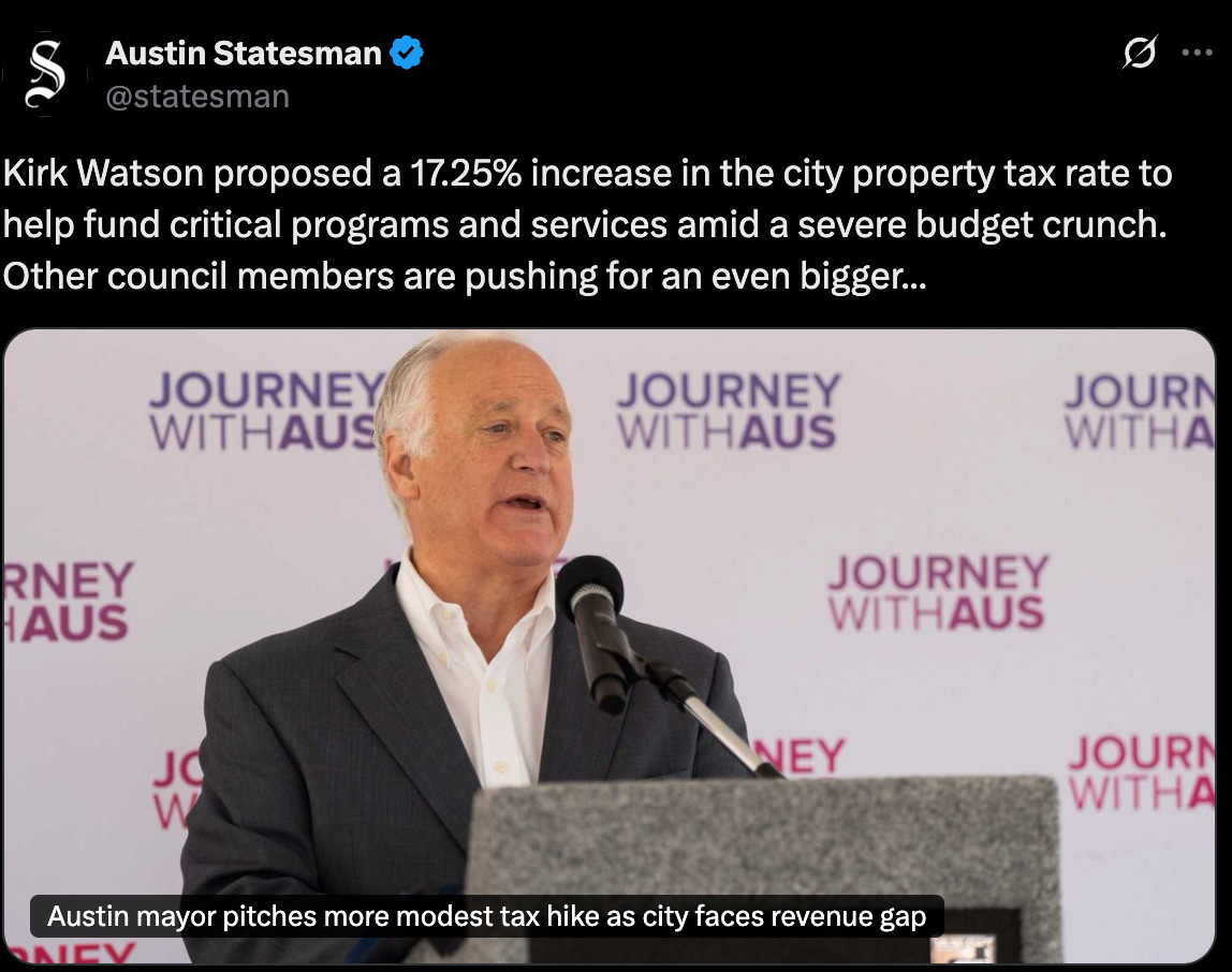 At least a few of you will notice the late time stamp on my delivery this weekend. You’ve caught me. What happened? I got waylaid wading through the 1,336-page proposed 2025-26 Budget for the City of Austin, prompted by a proposal from the Mayor to raise property taxes by ~17% to fund a $6.3B annual budget (up 5% from last year).
