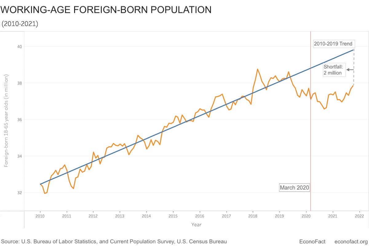 Labor Shortages and the Immigration Shortfall. Here. An explanation of why there is a labor shortage (see chart below): The loss of foreign workers is not the only reason for the high rate of unfilled jobs. Increased retirement and increased bargaining power of workers are likely playing an important role. I have been following closely the newly emerging social labor contract and the increasing unionization at places like Starbucks,