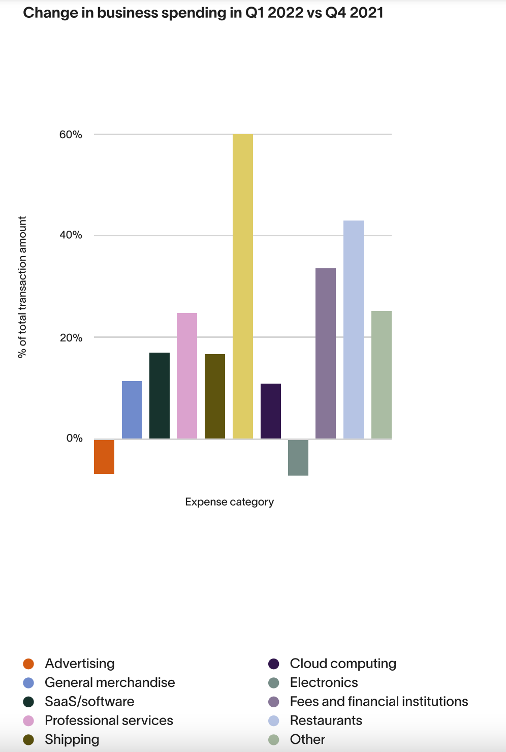Q1 2022 Spending Benchmarks from Ramp. Here. Below is an interesting chart showing the reduction in advertising spending and electronics between Q4 2021 and Q1 2022. I won't post more because the formatting is terrible. The tall yellow bar is lodging. No surprise given it's up from a low base. Professional services is an interesting one that is a good leading indicator for the freelance economy.
