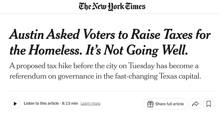 Anyway, the point of this song of the week, which has only 9 listens (3 of which are probably mine), was in honor of the defeat of Prop Q (63% to 37%) here in Austin, Texas. Prop Q was a referendum to raise property taxes to fund city services, but what I think is notable is that this time, voters (and a strong bipartisan coalition in town) pushed back hard, forcing the city to examine its spending and focus on delivery.