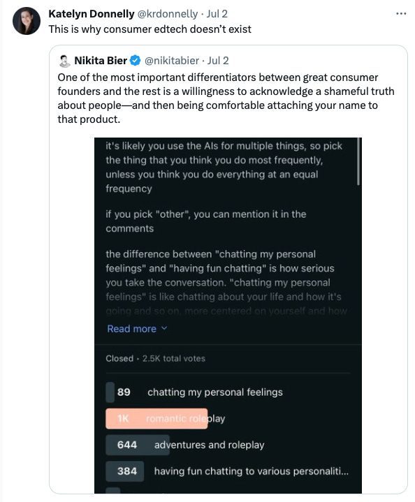 A quick note here. Yes, of course, some consumer education and learning technology exists. People have made various models work. Duolingo is an interesting example, maybe Udemy, or Codecademy, also. But the most essential aspect of getting engagement and discussion going on Twitter is throwing out a binary, absolutist statement as a provocation.